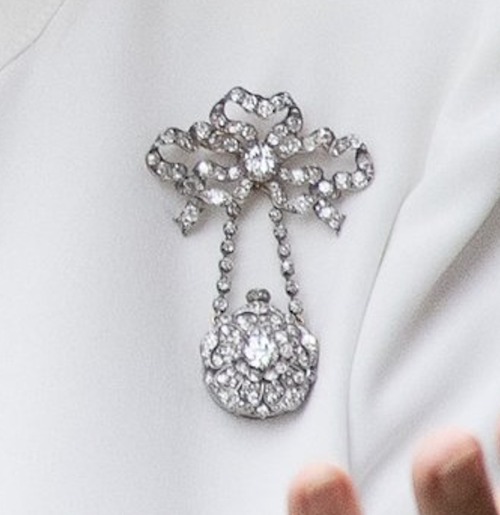 At some point by the mid-1930s, Queen Mary gave the Diamond Watch Brooch to her daughter-in-law, the then Duchess of York, who wore it for a visit to British Industries House in July 1936, a few months before her husband’s accession to the Throne, as discovered by our wonderful Beth of HFJC. Despite not being publicly worn, the Brooch no doubt remained in her collection until her death in 2002 and was not worn by the late Queen either.