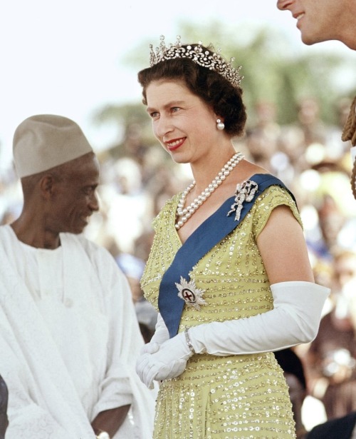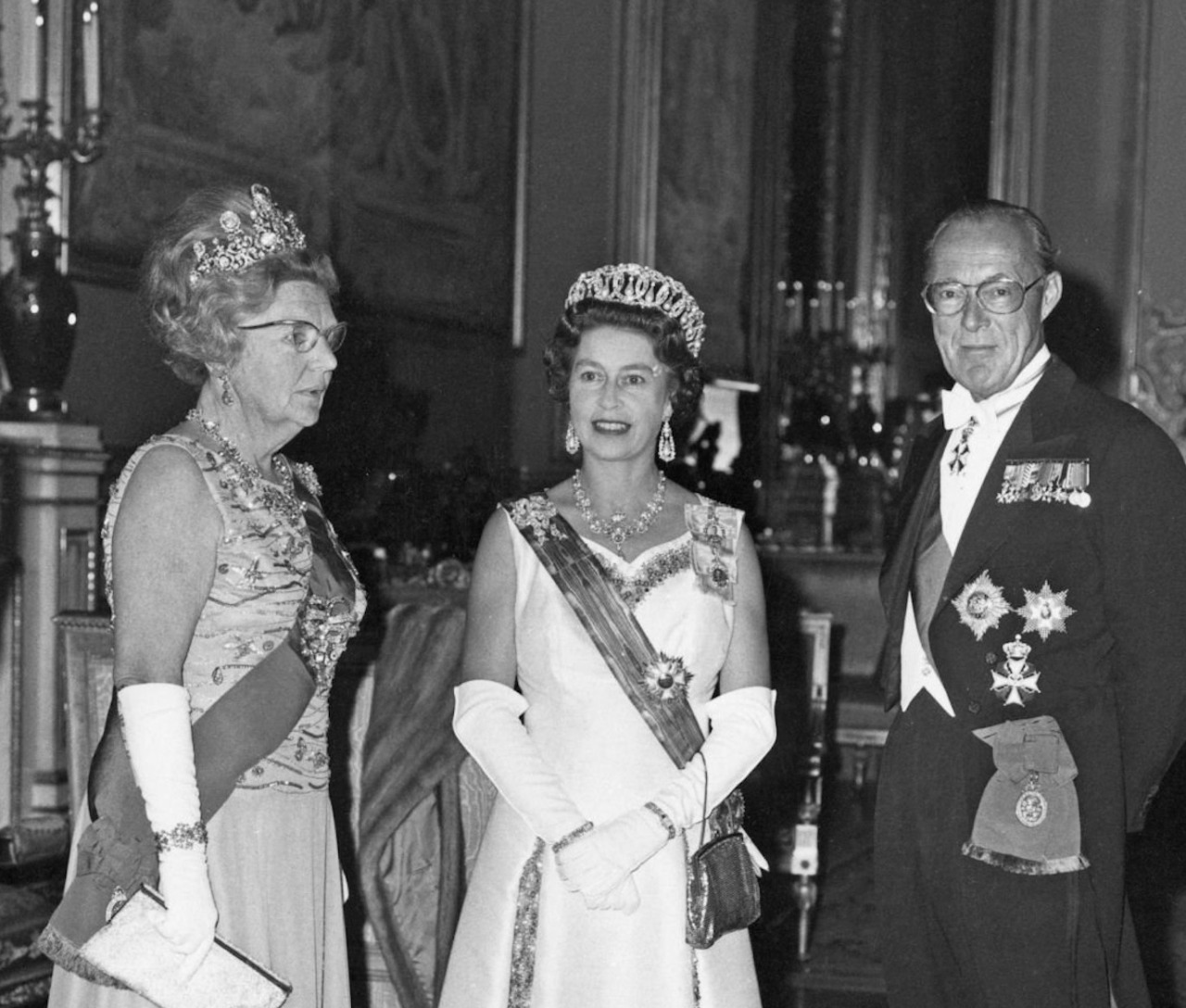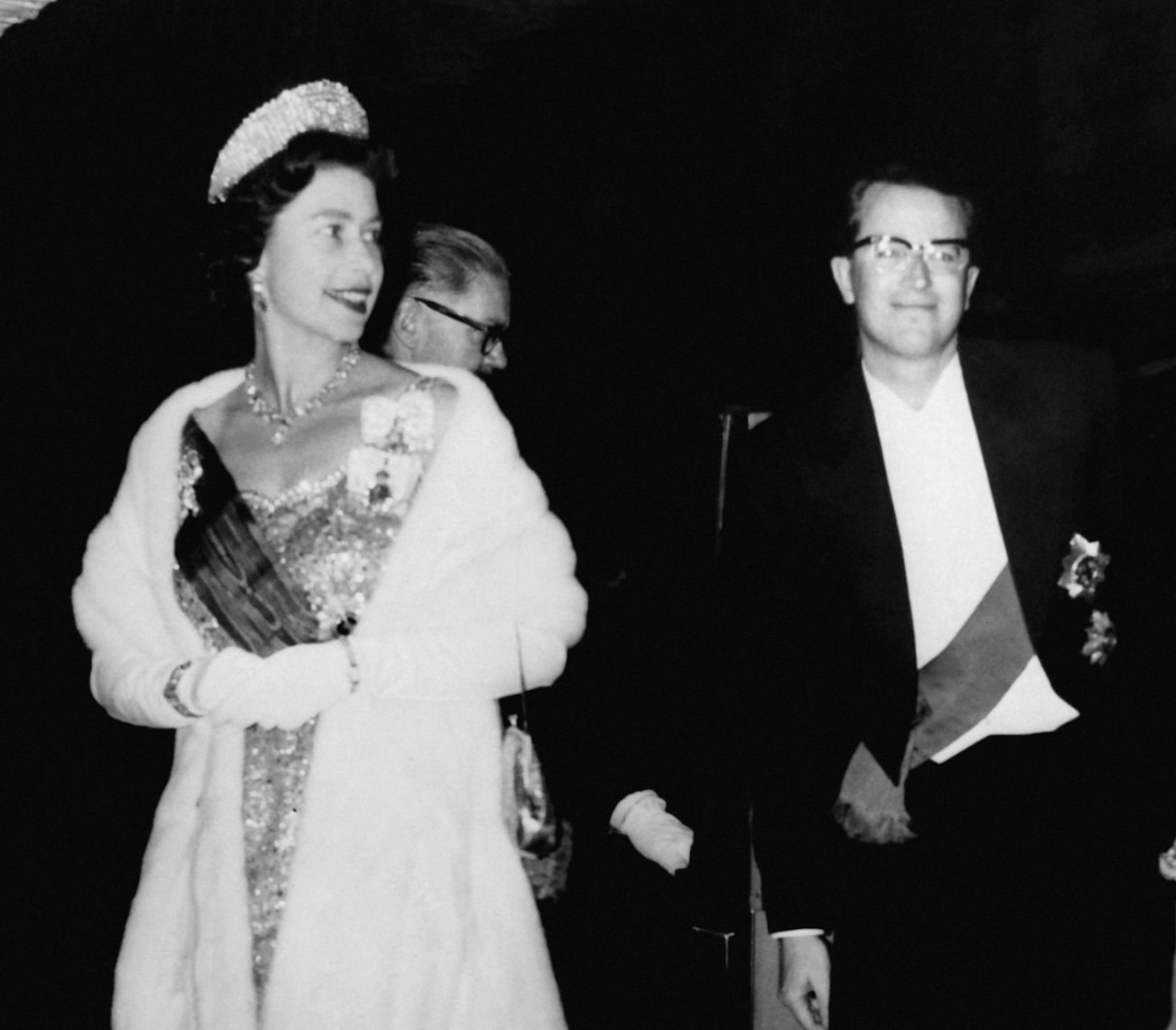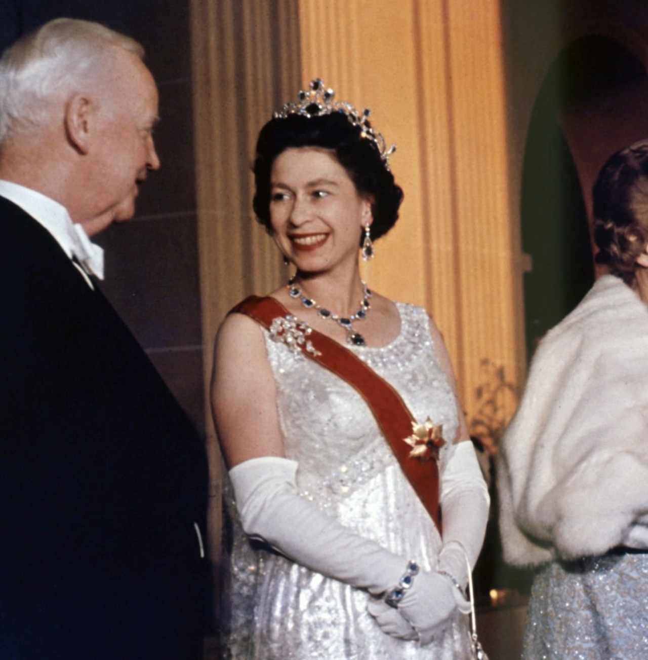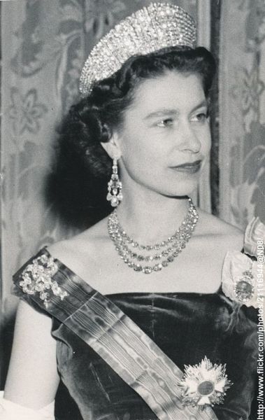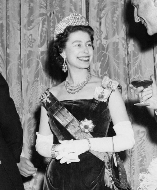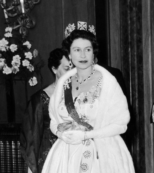 The Lover’s Knot Brooch was among the jewels inherited by the Queen in 1953, being worn with the Girls of Great Britain and Ireland Tiara, Vladimir Tiara, or Queen Alexandra’s Kokoshnik Tiara or Queen Mary’s Lover’s Knot Tiara, on numerous occasions like the State Visit to the Netherlands in 1958, the French State Visit in 1960, and the State Visit to Germany in 1965 among other occasions.