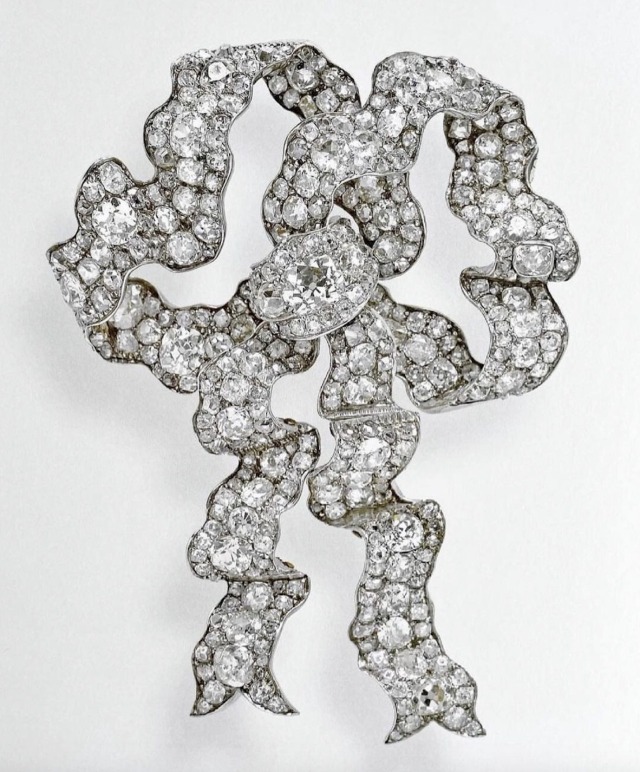 In 1932, Queen Mary acquired this striking Diamond Lover’s Knot Brooch from Garrard in London, composed of brilliant cut diamonds set in silver and gold tied in a “lover’s knot”. The scalloped ribbon has joints on each of the “tails” to allow the ends to move.