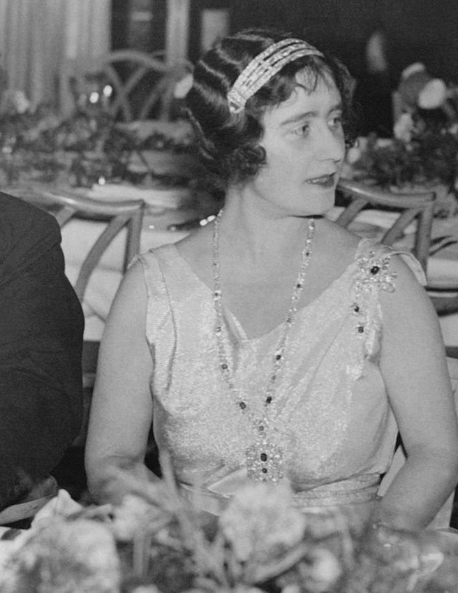 The Duchess of York wore the Turquoise Brooch and the Earrings as pendants from strings of pearls for a series of portraits with the Lotus Flower Tiara soon after her marriage, and she also notably wore the Brooch on a Tour of Australia in 1927.