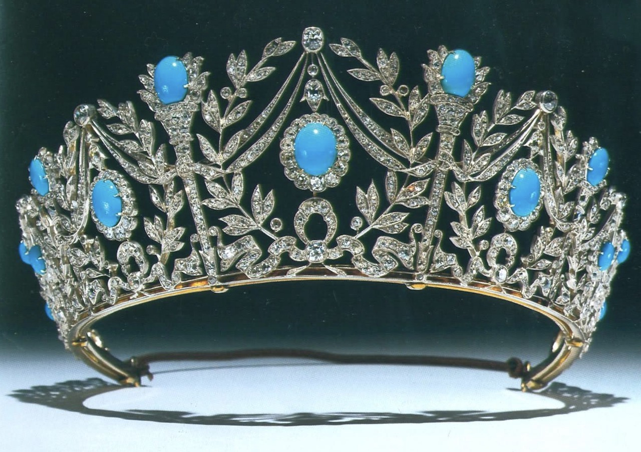 The diamond and turquoise tiara made by R. & S. Garrard, c. 1900. In the lore of precious stones the turquoise stands for love, and the message is endorsed in this beautiful jewel that incorporates the lamps of love, triumphal laurels and true-lovers’ knots.