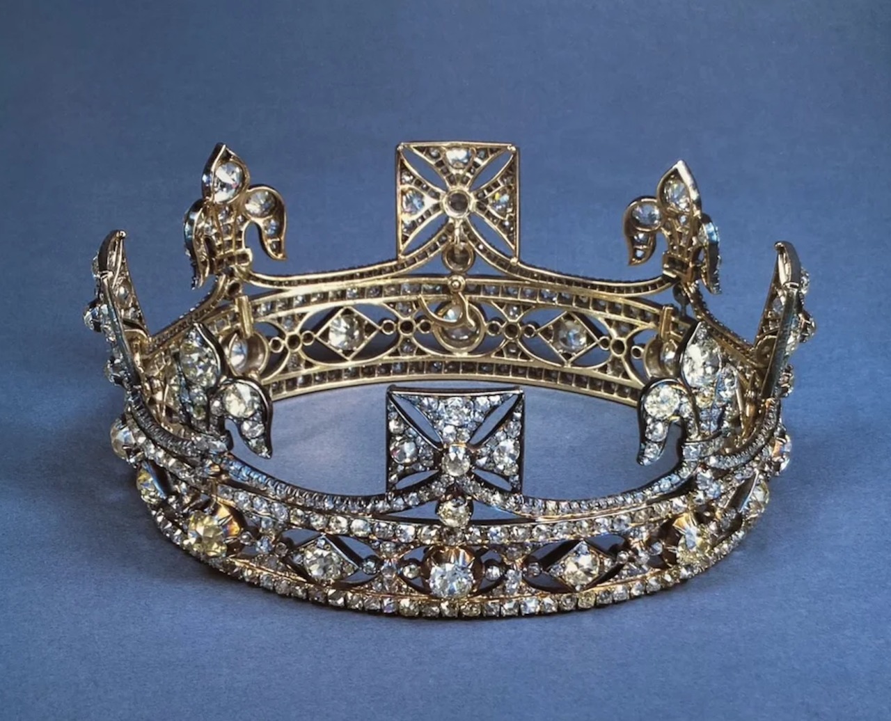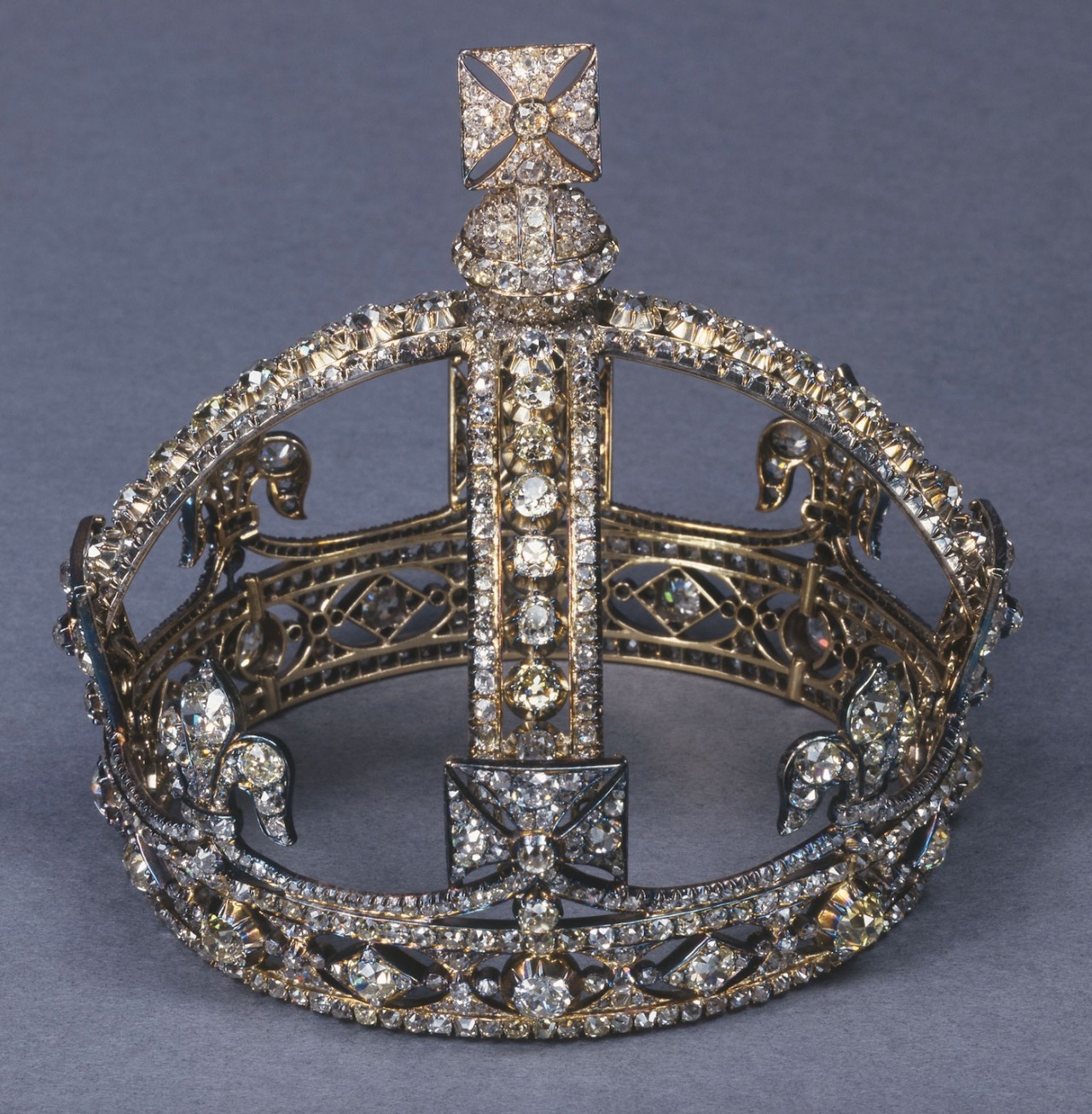 The crown comprises an openwork silver frame set with 1,187 brilliant-cut and rose-cut diamonds in open-backed collet mounts. The band is formed with a frieze of lozenges and ovals in oval apertures, between two rows of single diamonds, supporting four crosses-pattée and four fleurs-de-lis, with four half-arches above, surmounted by a monde and a further cross-pattée.
