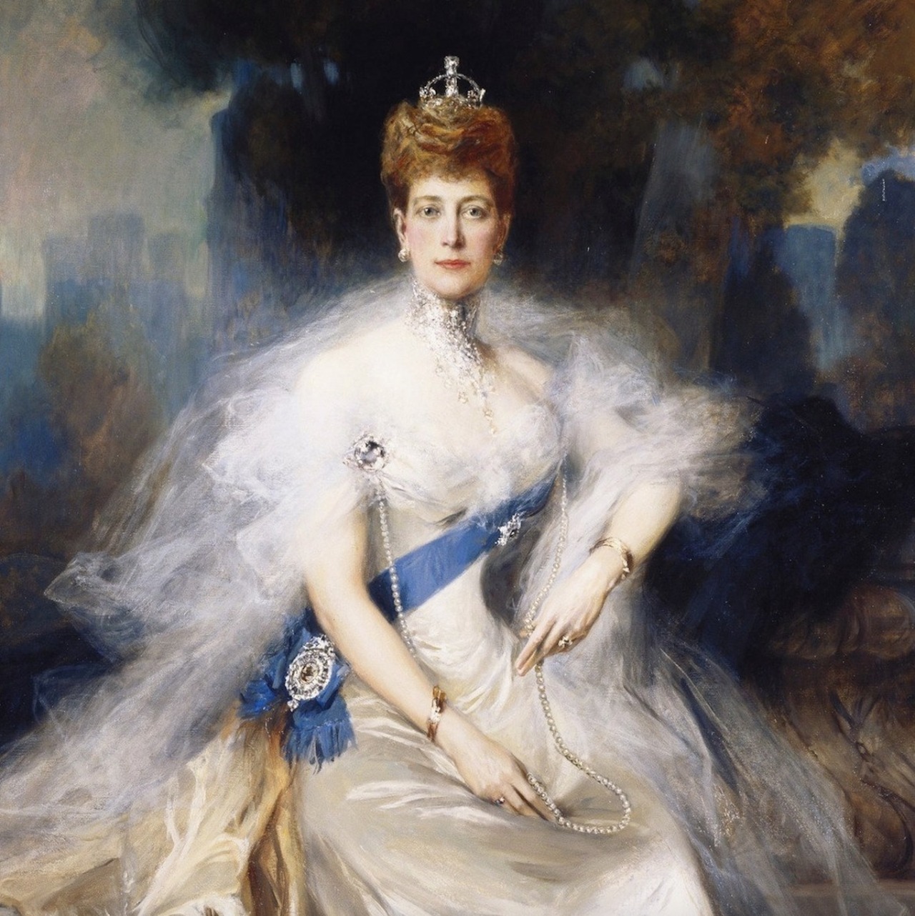 Queen Alexandra also notably wore the Small Diamond Crown with her Cartier Collier Résille and Koh-i-Noor Diamond for an iconic portrait by François Flameng, which hangs in the White Drawing Room at Buckingham Palace.