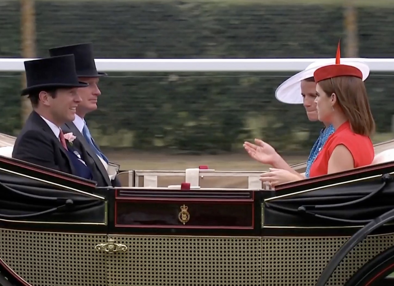 In the second carriage, Princess Eugenie of York and Jack Brooksbank with Mr and Mrs. Ed Walker.