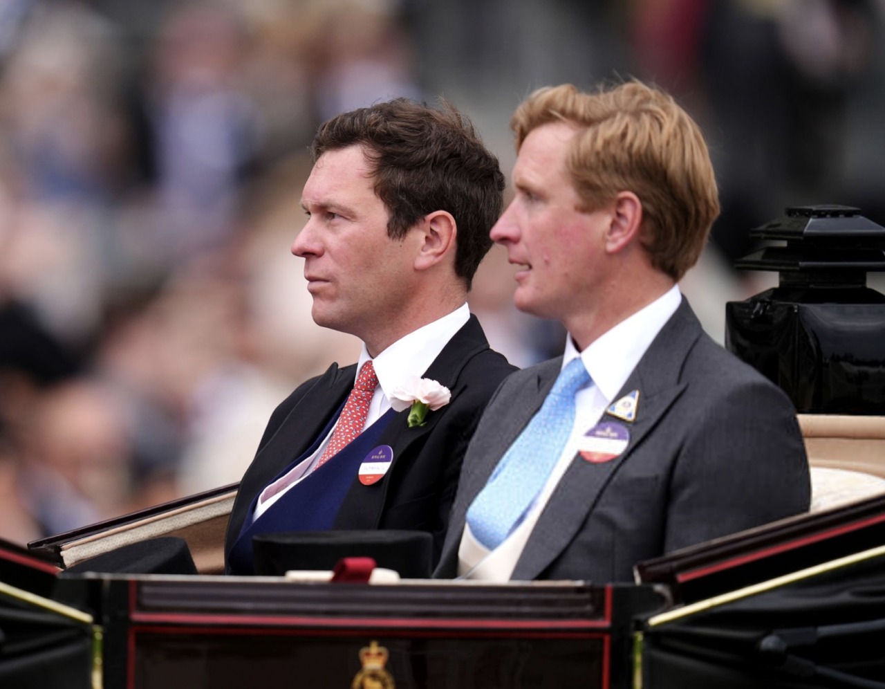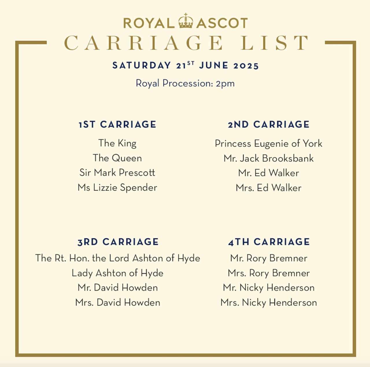 King Charles III and Queen Camilla (wearing a Diamond Watch Brooch given to Queen Mary by Alice de Rothschild in 1893) were joined by the Sir Mark Prescott and Ms Lizzie Spender in the First Carriage.