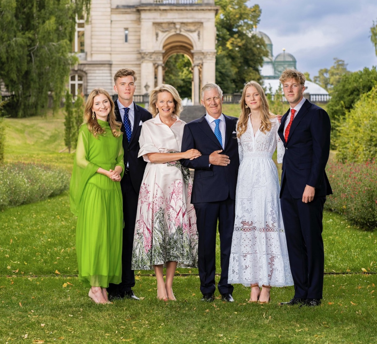King Philippe and Queen Mathilde of Belgium with the Duchess of Brabant, Prince Gabriel, Prince Emmanuel, and Princess Eléonore of Belgium.