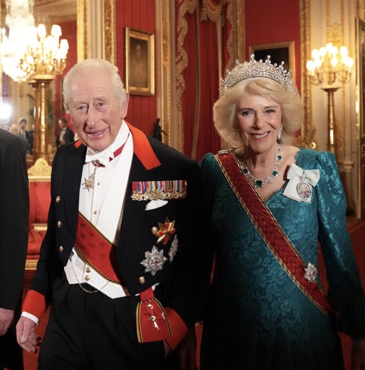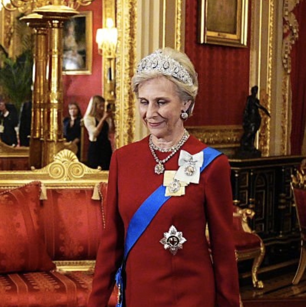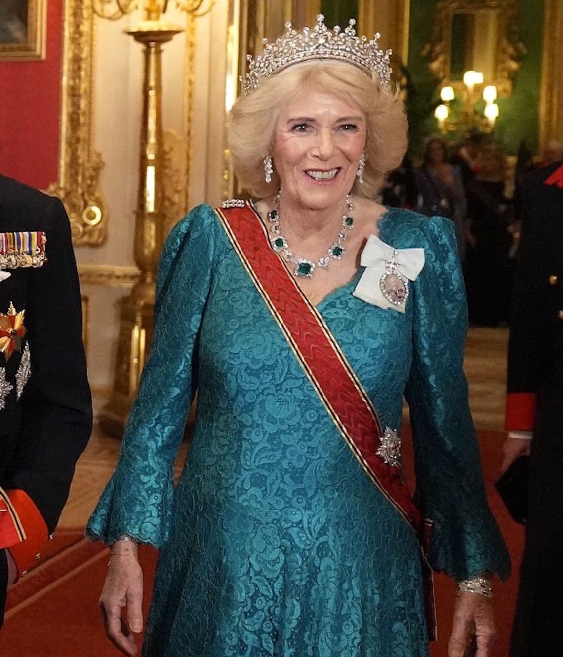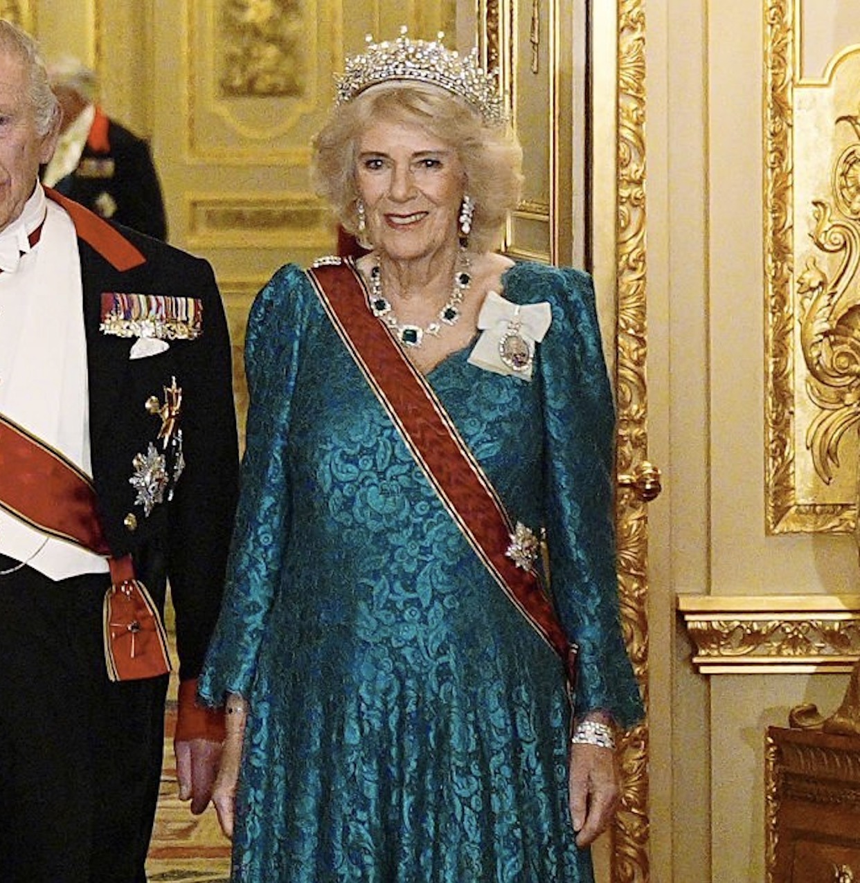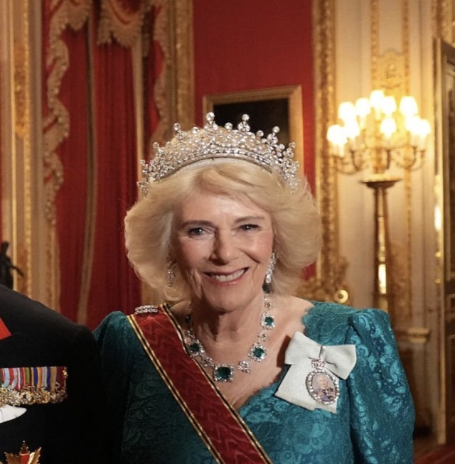 Queen Camilla wore the Girls of Great Britain and Ireland Tiara, recently returned from the Edwardians Exhibition at Buckingham Palace, and Greville Emerald Necklace, as well as her Modern Diamond EarringsQueen Victoria’s historic Diamond Bar Brooch and the Queen Mother’s Cartier Bracelets, along with the Order of Merit of the Federal Republic of Germany, the Star of the Order of the Garter, and the Royal Family Order of King Charles III.