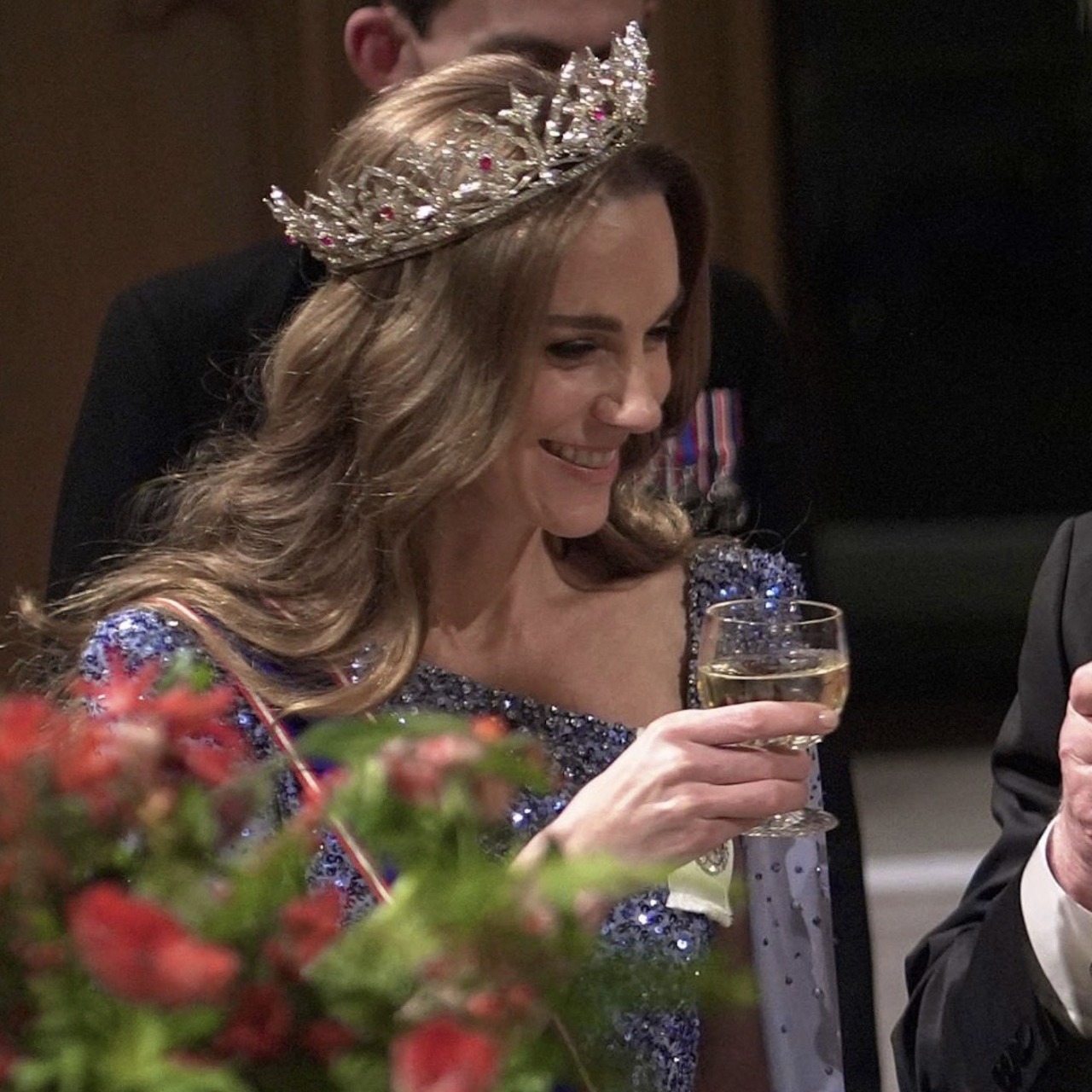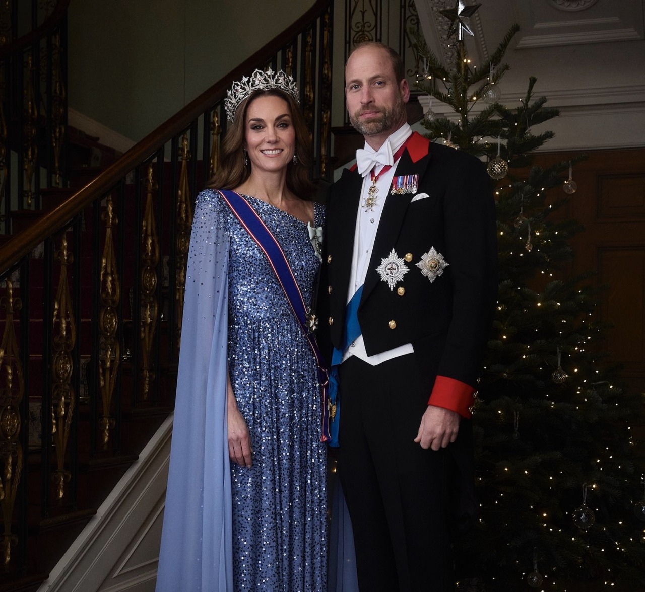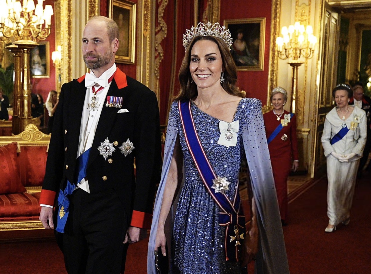 The Princess of Wales wore Queen Victoria’s Oriental Circlet Tiara and her Diamond Chandelier Earrings with the Sash and Star of the Royal Victorian Order, and the Royal Family Order of King Charles III.