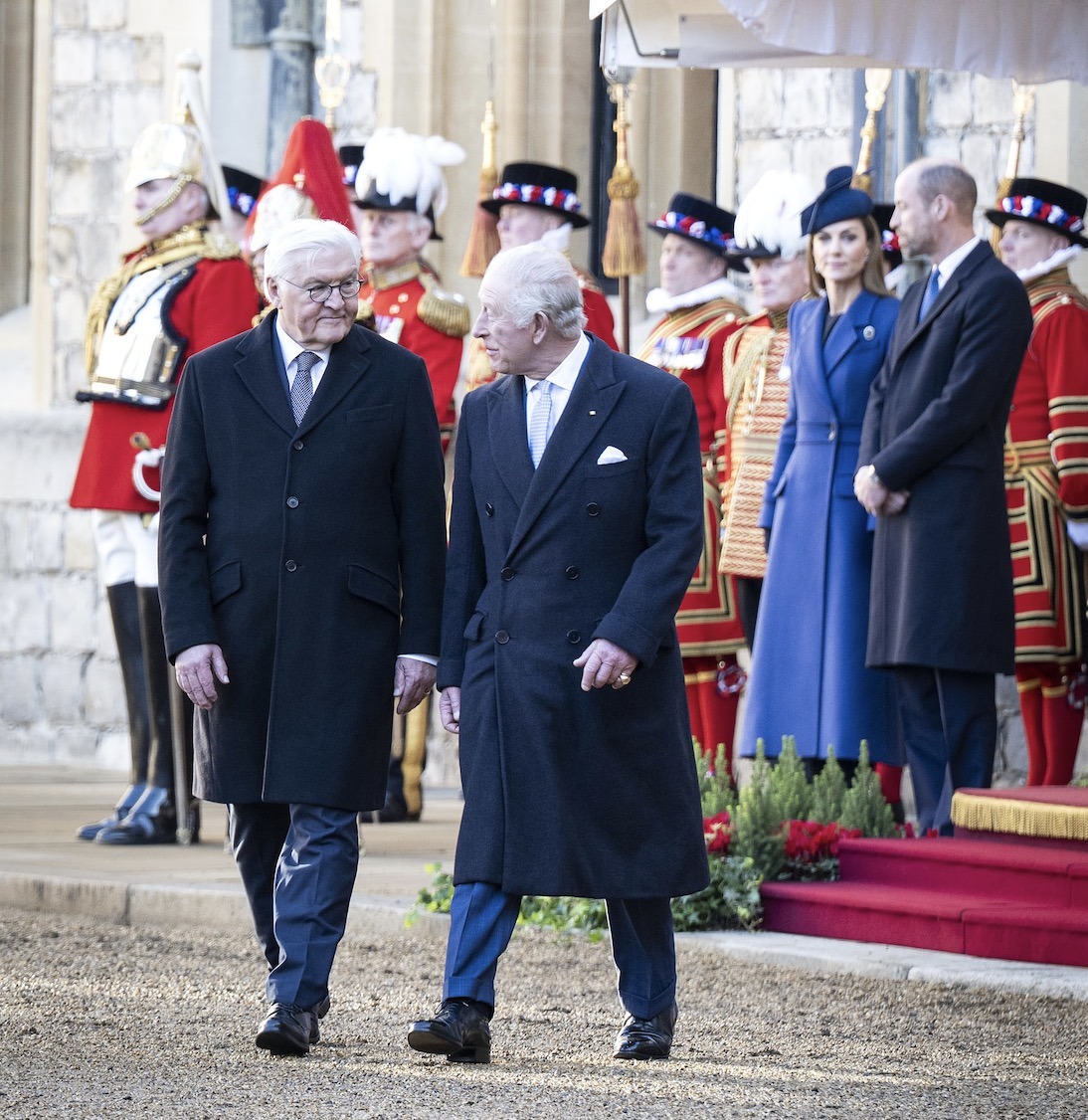 The Prince and Princess of Wales greeted German President Frank-Walter Steinmeier and First Lady Elke Büdenbender at Heathrow Airport and traveled with them to Windsor Castle.