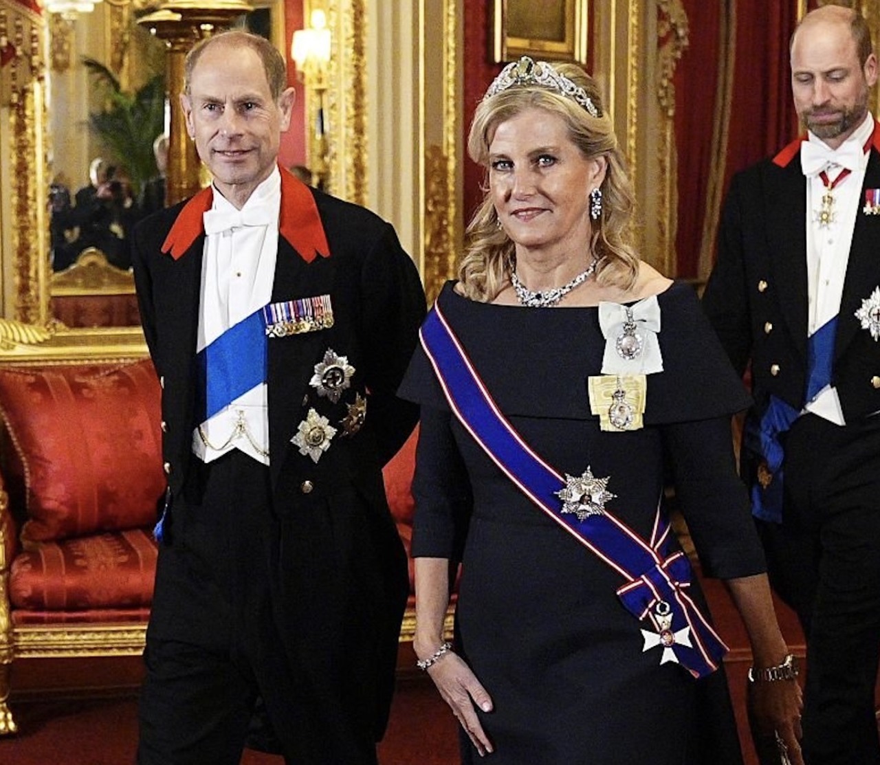 The Duchess of Edinburgh wore her Aquamarine Tiara and Sapphire Suite with the Sash and Star of the Royal Victorian Order, the Royal Family Order of King Charles III, and the Royal Family Order of Queen Elizabeth II.