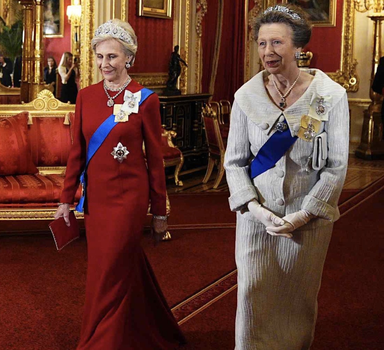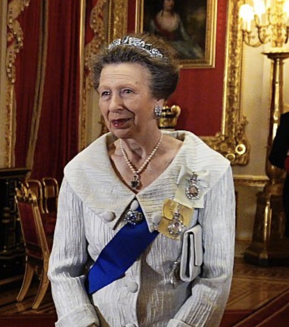 The Princess Royal wore her Aquamarine Pine Flower Tiara, the Sash and Star of the Order of the Garter, the Royal Family Order of King Charles III, and the Royal Family Order of Queen Elizabeth II.