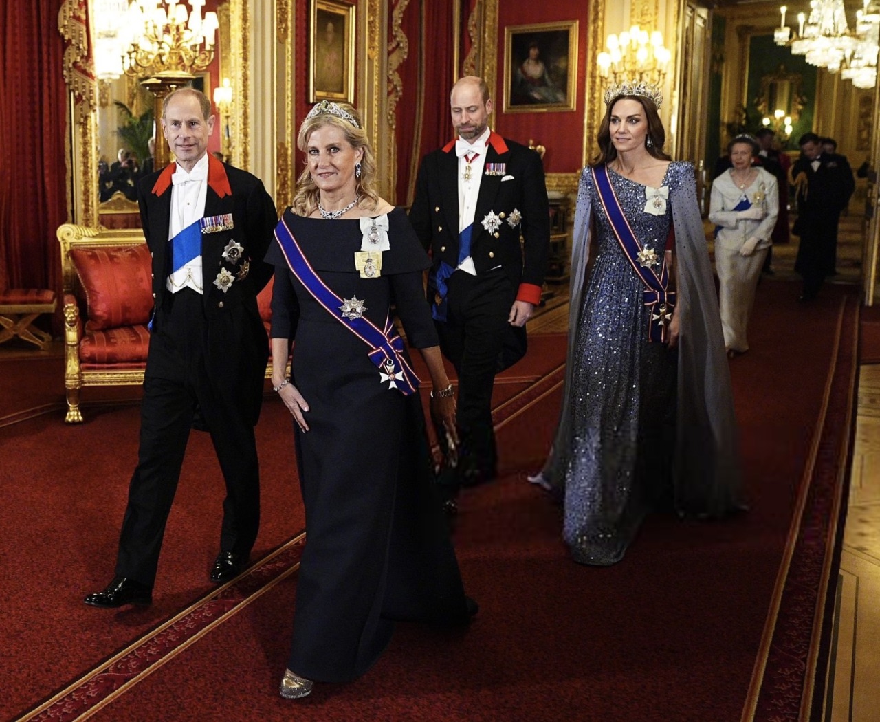 The Duchess of Edinburgh wore her Aquamarine Tiara and Sapphire Suite with the Sash and Star of the Royal Victorian Order, the Royal Family Order of King Charles III, and the Royal Family Order of Queen Elizabeth II.