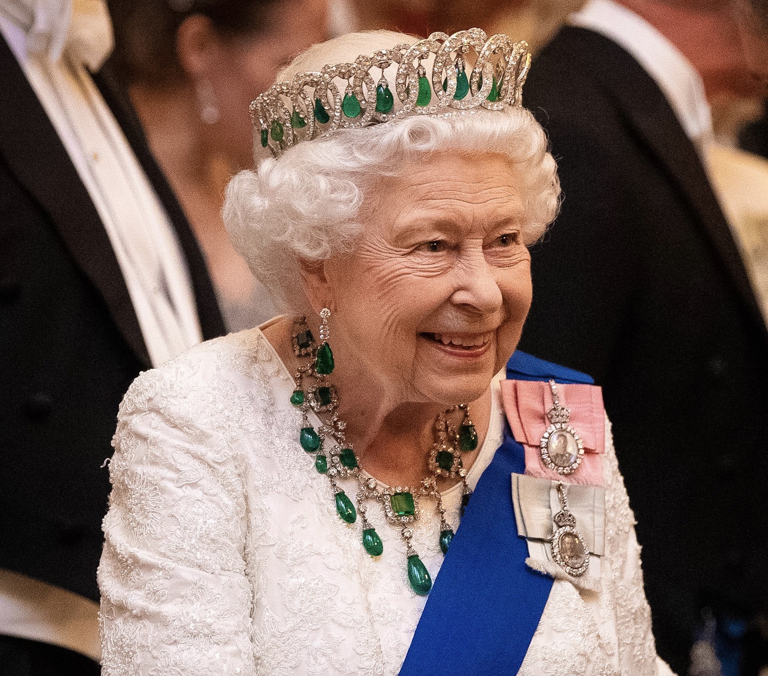 Queen Camilla wore the Girls of Great Britain and Ireland Tiara and Greville Emerald Necklace the Order of Merit of the Federal Republic of Germany, the Star of the Order of the Garter, and the Royal Family Order of King Charles III.