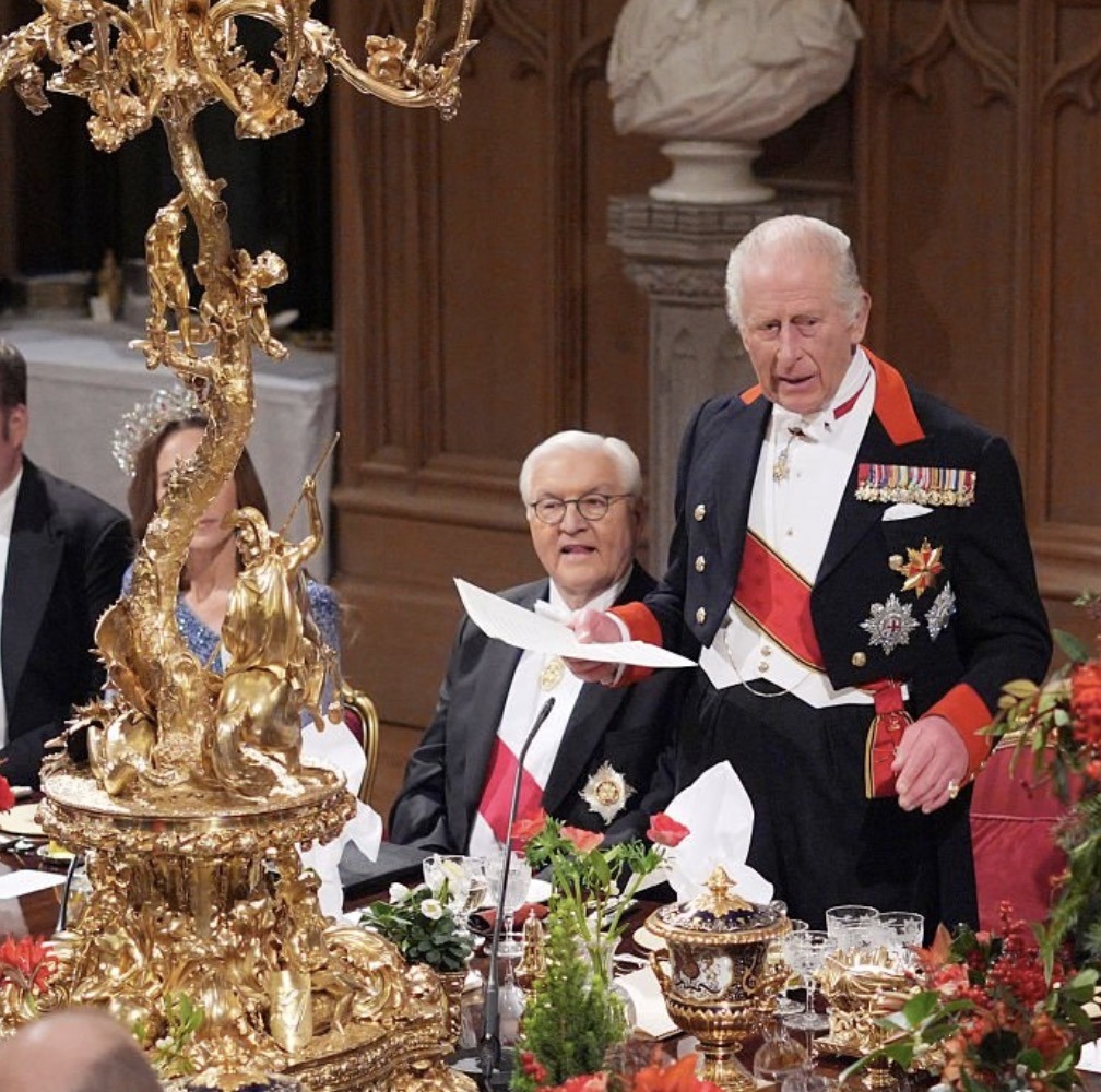 In the evening, King Charles III and Queen Camilla held a State Banquet in honour of President Frank-Walter Steinmeier and First Lady Elke Büdenbender at Windsor Castle. Both the King and President gave Speeches.