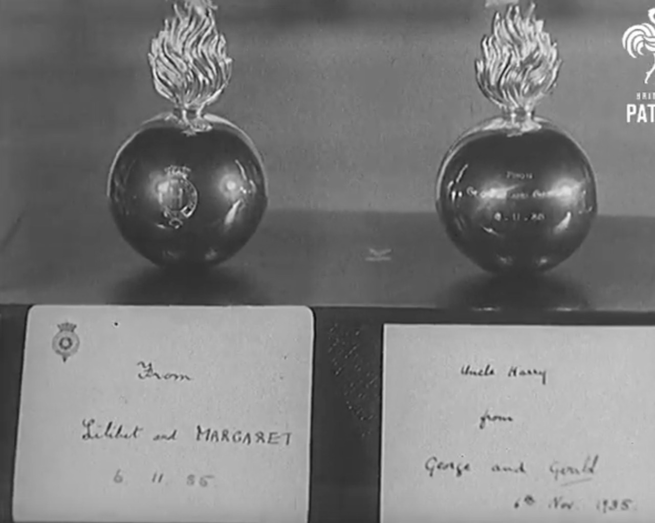 The groom’s nieces and nephews, Princesses Elizabeth and Margaret of York and Viscount Lascelles and the Hon. Gerald Lascelles, gave a pair of grenade-shaped table cigarette lighters.