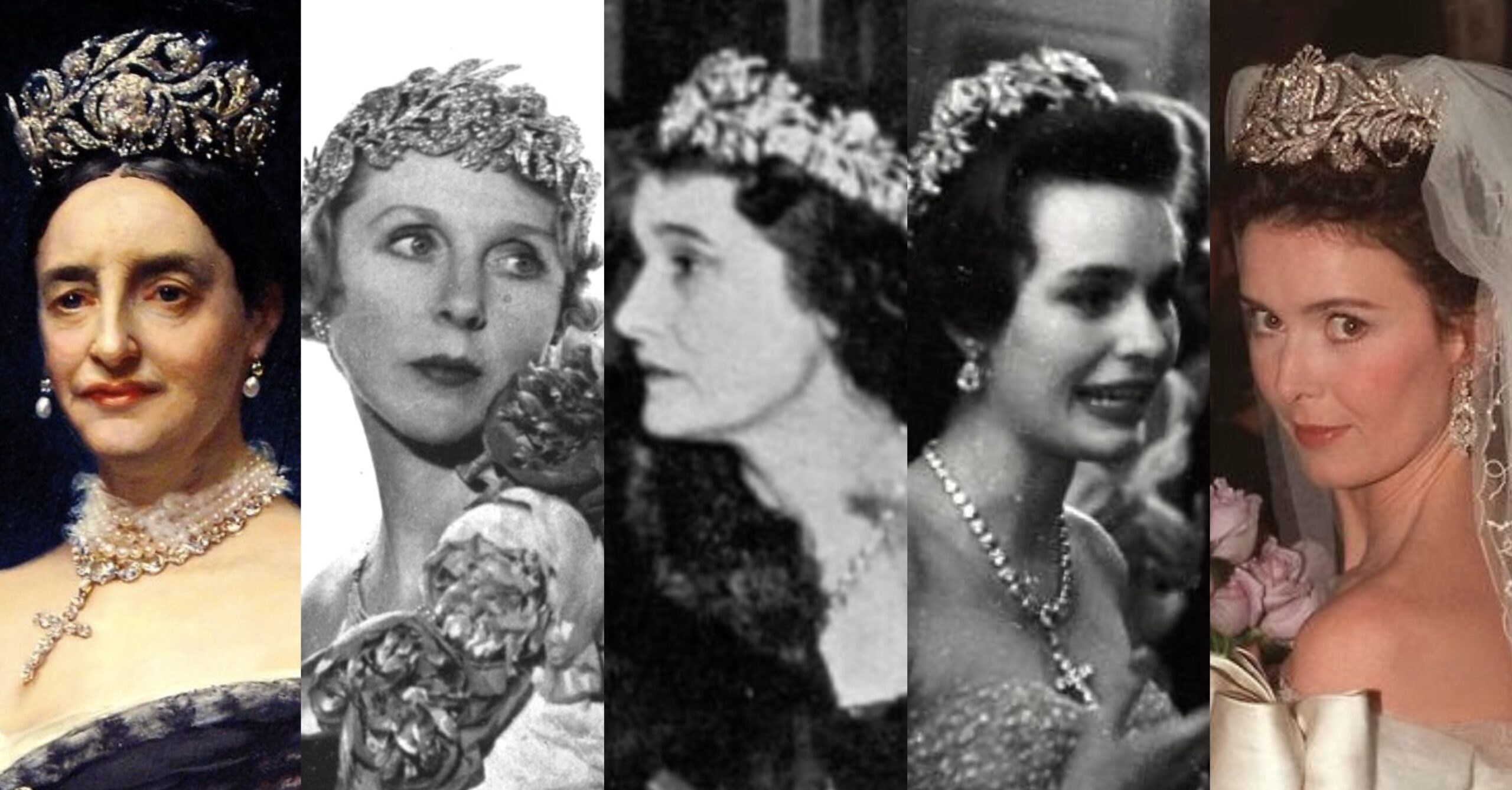 Incredibly grand, a very high Tiara, with flowers emblematic of marriage, with a big diamond necklace, pendant cross and pearls.
