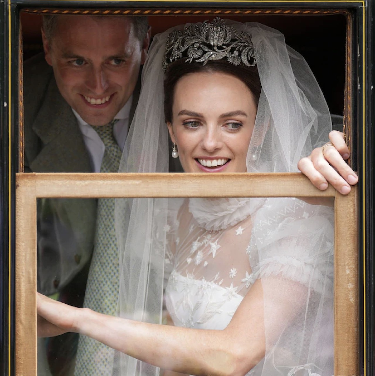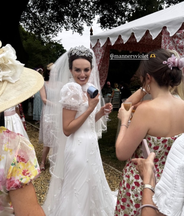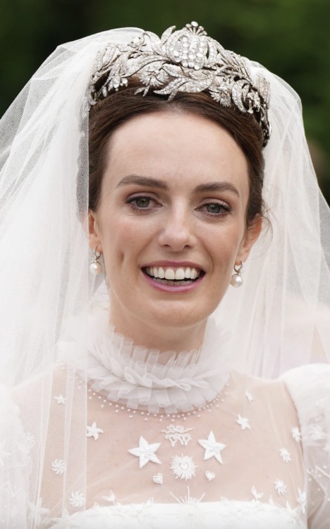 As expected, Lady Violet Manners appears to be wearing the heirloom Rutland Tiara for her Wedding to Viscount Garnock at Belvoir Castle today!