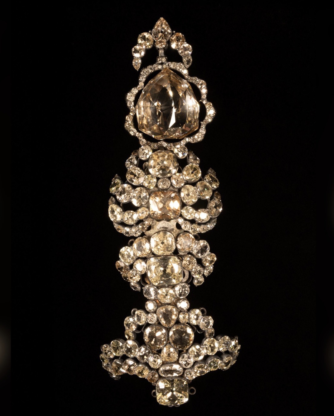 There is a bodice bow made of rubies, emeralds, and diamonds in the Hungarian national colors, which once belonged to Sisi. And there is the fateful stone, that large yellow diamond of 137 carats.