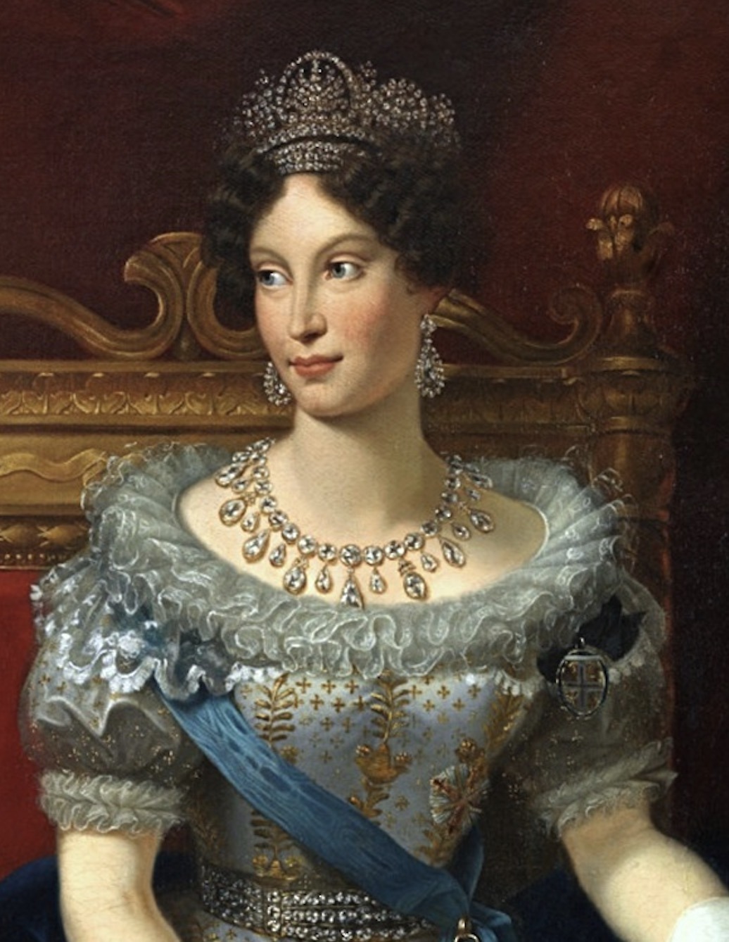 Most interestingly, Gabrielle seems to be wearing a strand of Queen Marie-José’s Sapphire Necklace, one of which was inherited by her grandmother, Princess Maria Gabriella, while the other was last seen on the Princess of Venice two decades ago.