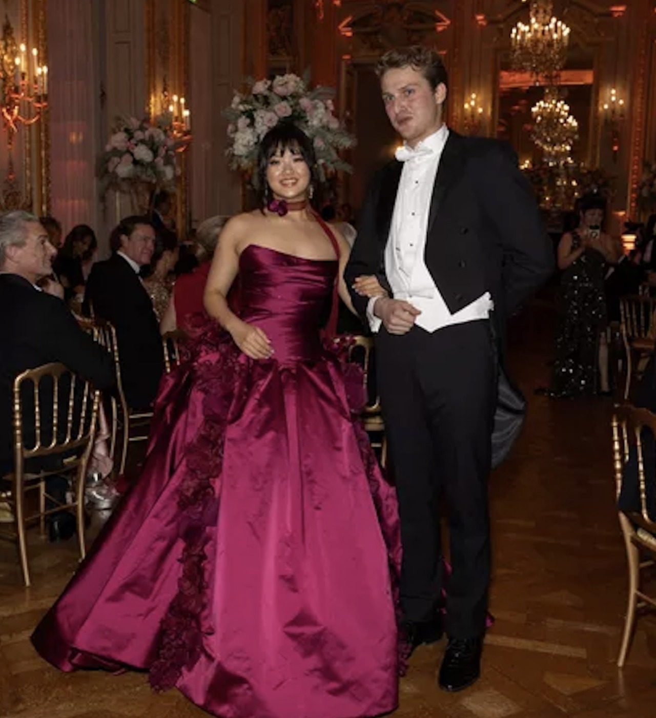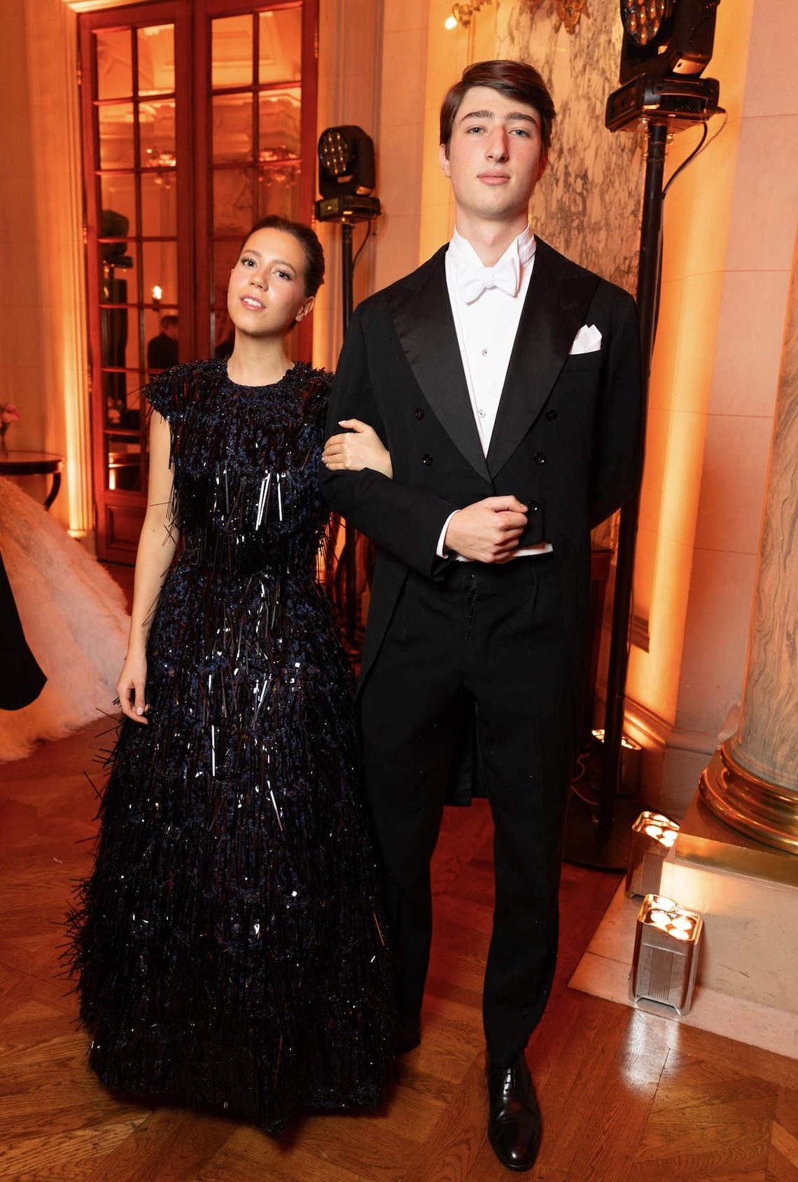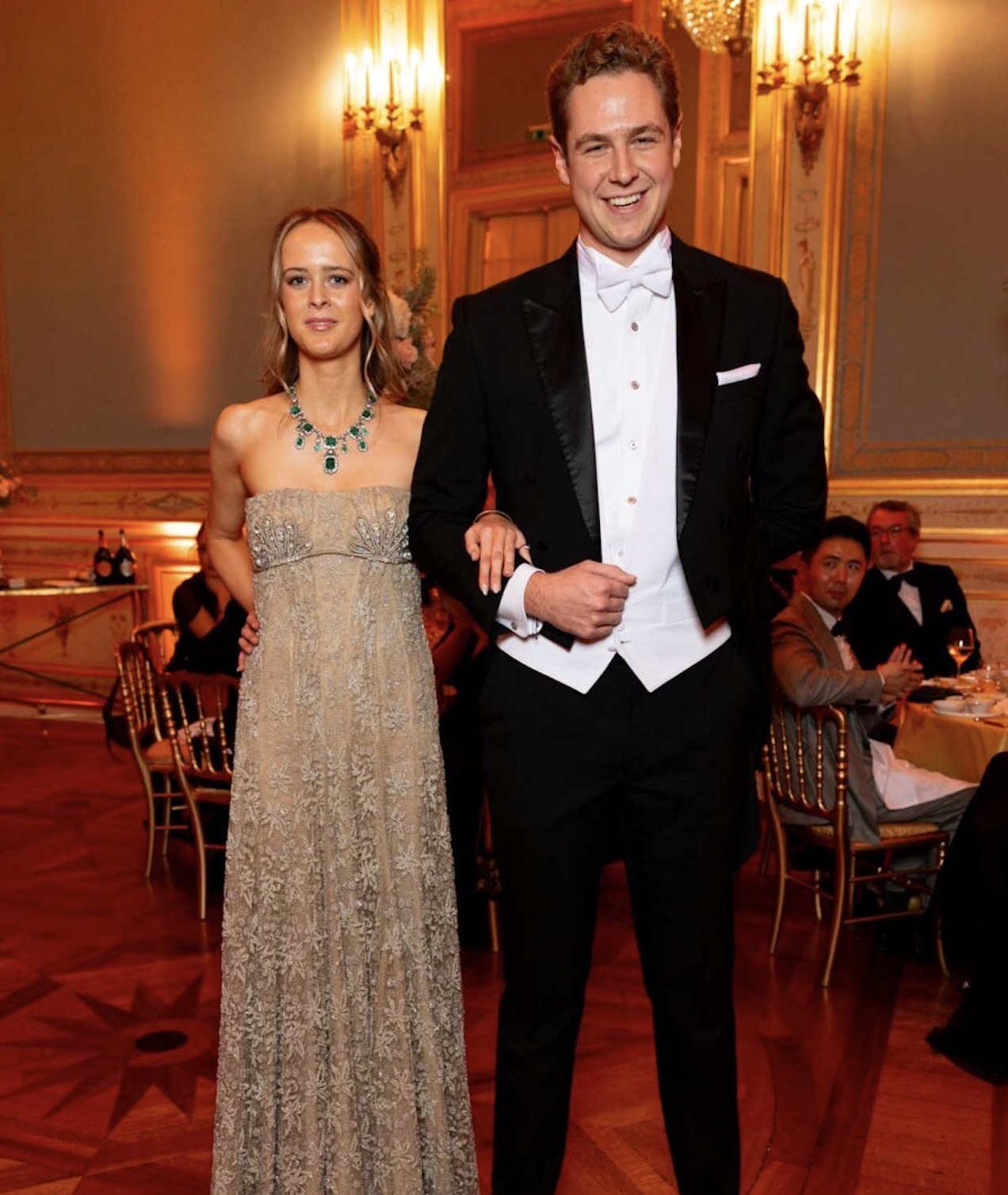 Gabrielle Janssens de Balkany (wearing Luisa Beccaria) and her escort Thomas Janssens de Balkany